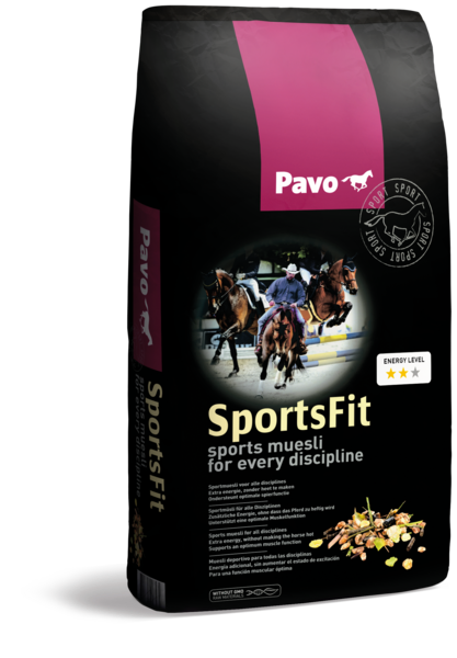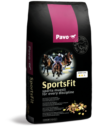 Pavo SportsFit to idealne musli dla koni sportowych i wszystkich dyscyplin jeździeckich – ujeżdżenia, WKKW, powożenia i skoków. Przeznaczone jest dla koni, które mają uzyskać wysokie wyniki sportowe bez przechodzenia w nadmierne pobudzenie. Idealne połączenie energii pochodzącej z oleju i skrobi pomaga zaspokoić zapotrzebowanie energetyczne koni sportowych na każdym poziomie wyszkolenia.