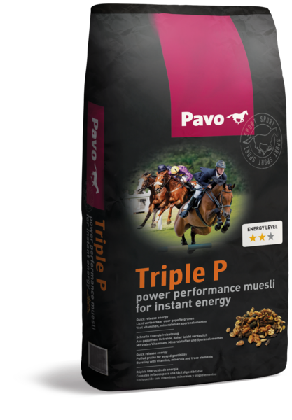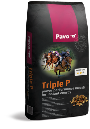 W przeciwieństwie do sportów wytrzymałościowych (WKKW, rajdy), konie wykonujące krótkie, ale intensywne występy sportowe wymagają dużo energii, która jest szybko uwalniana. Pavo Triple P to smaczne musli energetyczne dla koni sportowych i kuców wykorzystywanych na przykład w skokach, jeździe westernowej, wyścigów kłusaków lub gonitwach wyścigowych oraz tych które niechętnie jedzą paszę podczas zawodów i wykonują średnią oraz ciężką pracę.