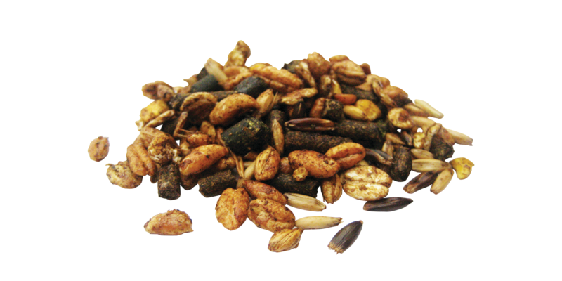Owies, jęczmień spęczniały, lucerna, prażona kukurydza bez GMO, melasa trzcinowa, łuski orkiszu, śruta pszenna, prażona poekstrakcyjna śruta sojowa bez GMO, płatki soi bez GMO, poekstrakcyjna śruta słonecznikowa, jęczmień, olej sojowy bez GMO, węglan wapnia, chlorek sodu, tlenek magnezu, drożdże piwne, CellProtect