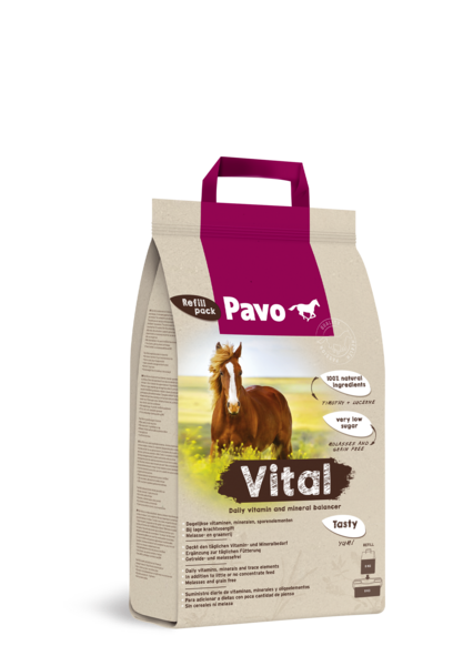 Pavo Vital to pasza mineralna w formie granulatu, niezawierająca zbóż i melasy, o bardzo niskiej zawartości cukru i skrobi (tylko 4,74%). Dzięki temu doskonale nadaje się dla koni i kucyków, które są wrażliwe na cukier lub otrzymują mało lub wcale nie otrzymują paszy treściwej. Składniki są prasowane w specjalny sposób, dzięki czemu struktura trawy tymotki i lucerny jest wyraźnie widoczna w granulacie.