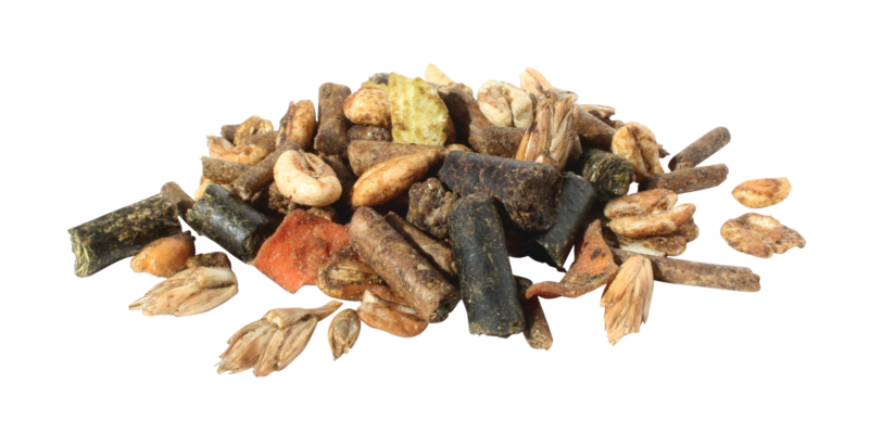 Lucerna, pszenica paszowa, łuski orkiszu, orkisz, prażona poekstrakcyjna śruta sojowa bez GMO, melasa trzcinowa, poekstrakcyjna śruta słonecznikowa, jęczmień, olej sojowy bez GMO, wytłoki jabłkowe, siemię lniane, pszenica, jęczmień spęczniały, kukurydza prażona bez GMO, płatki grochu, chlorek sodu, węglan wapnia, tlenek magnezu, otręby pszenne, suszone płatki marchwi, pulpa z cykorii, olej lniany