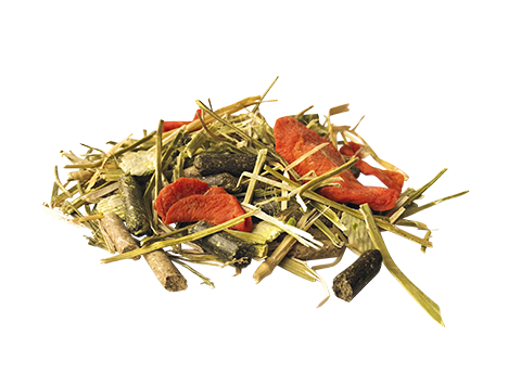 Lucerna, prażona poekstrakcyjna mączka sojowa bez GMO, granulat z trawy tymotki, białko ziemniaczane, suszone płatki marchwi, olej lniany, płatki grochu, słoma pszenna, melasa trzcinowa, chlorek sodu, węglan wapnia.