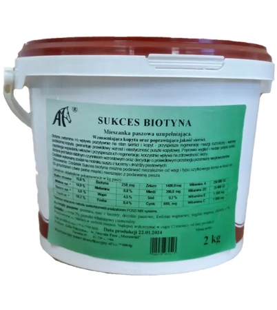 Dodatek Sukces biotyna można podawać niezależnie od wagi i typu użytkowego konia w ilości do 50 gr/szt/dzień mieszając z podawaną paszą.